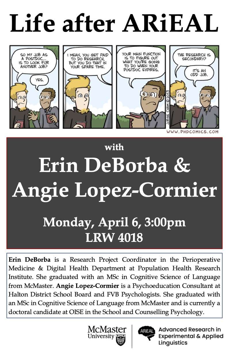 Erin DeBorba is a Research Project Coordinator in the Perioperative Medicine & Digital Health Department at Population Health Research Institute. She graduated with an MSc in cognitive science of language from McMaster. Angie Lopez-Cormier is a Psychoeducation Consultant at Halton District School Board and FVB Psychologists. She graduated with an MSc in cognitive science of language from McMaster and is currently a doctoral candidate at OISE in School and Counselling Psychology.